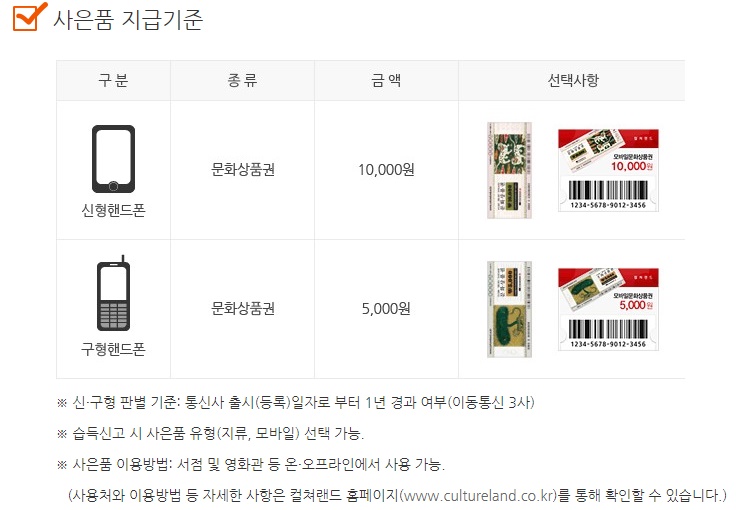 | 구형 핸드폰 | 문화상품권 | 5,000원 | 지류 OR 모바일 |